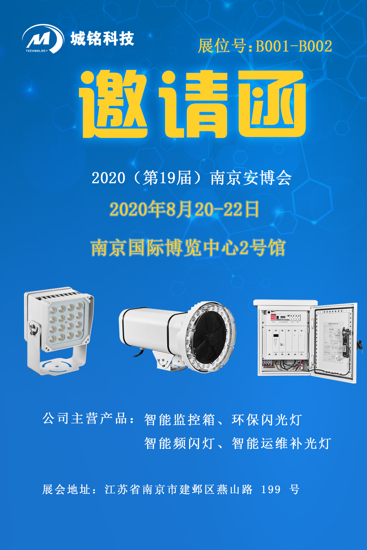 2020(第19屆)南京安博會將在南京國際博覽中心2號館隆重舉辦,本屆展會為期三天,展覽時間:2020年8月20日-22日,城銘科技應邀參展,展位號:B001-B002,并攜帶:智能運維補光燈、智能交通頻閃燈、環保閃光燈、智能監控箱等產品,城銘科技歡迎您蒞臨展會參觀交流。
